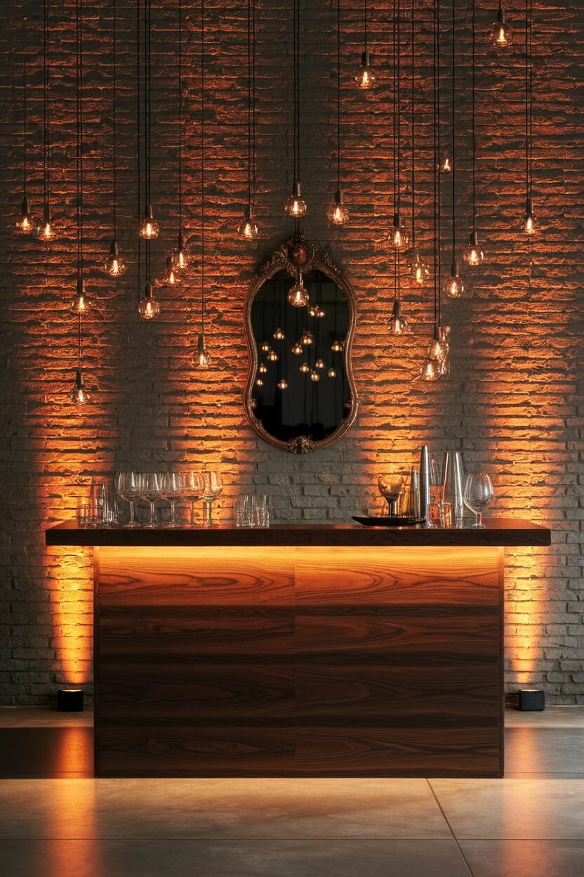 Imagine exposed brick walls, metal shelves, and Edison bulbs casting a warm glow. This style gives your bar a cool, urban vibe that’s both modern and cozy.