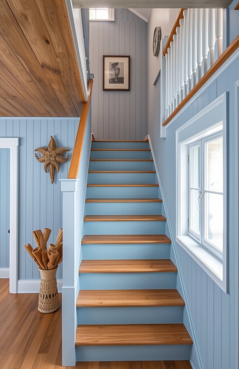 Pair with sandy tones or crisp whites for a beachy vibe. Aqua stairs are a great choice for homes that want to capture the essence of a tranquil seaside retreat.