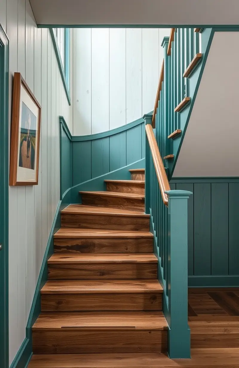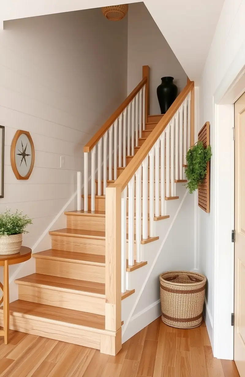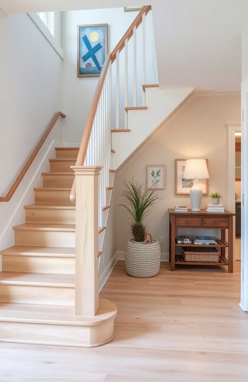 Bring the beach indoors with coastal-themed wooden stairs. Light wood and nautical details create a serene vibe.