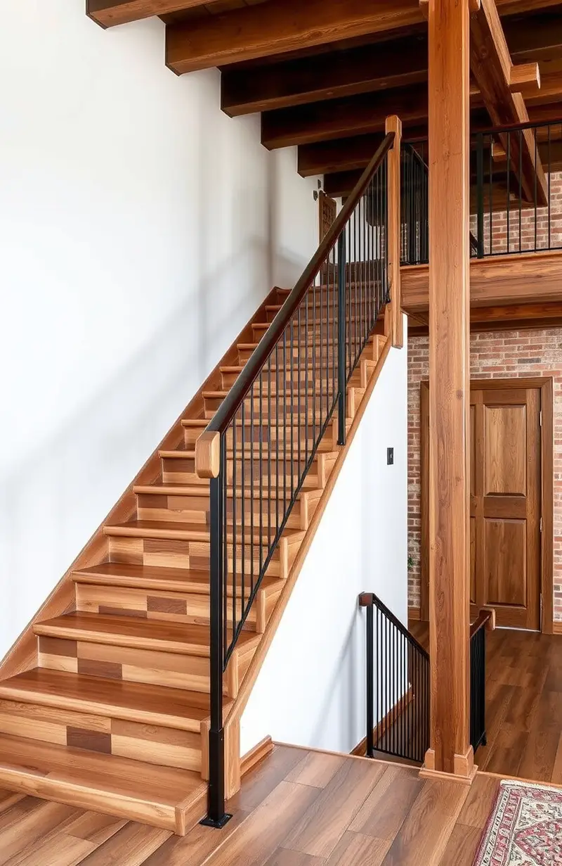 Combine wood and metal for an industrial edge. Exposed beams and metal accents add a modern twist to traditional stairs.