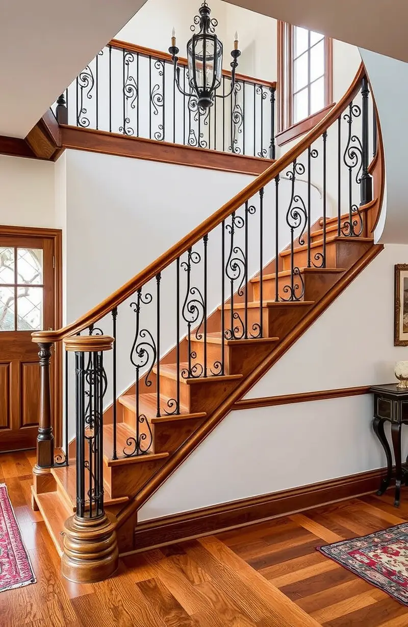 Pair wooden stairs with wrought iron railings for a timeless look. The contrast between materials is both elegant and striking.