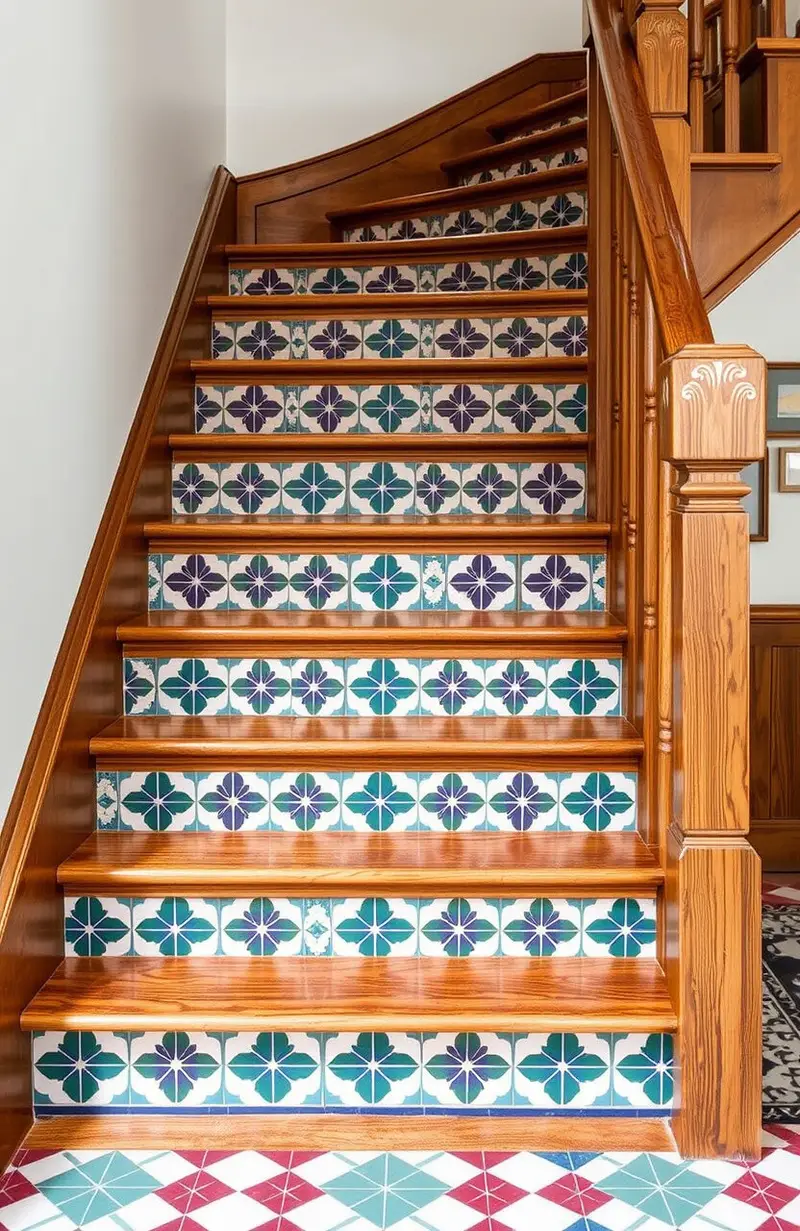 Add a pop of color with tiled risers. Brightly patterned tiles bring a splash of personality to wooden stairs.