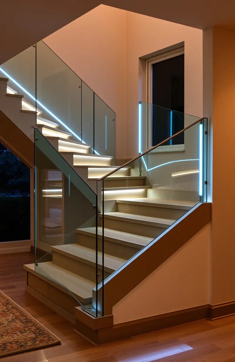 Glass railings with embedded LED strips create a modern, glowing effect. They add ambiance and style to staircases.