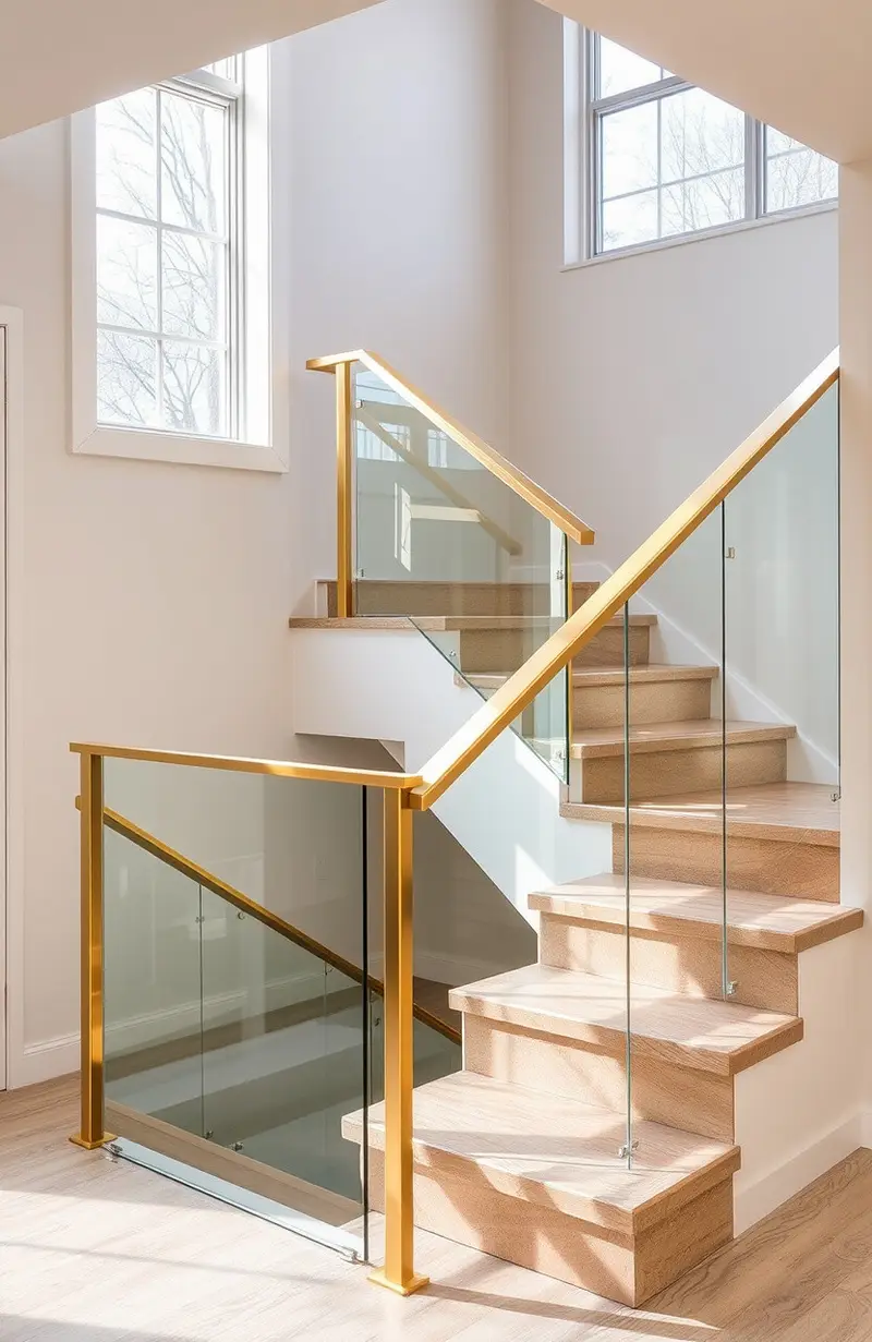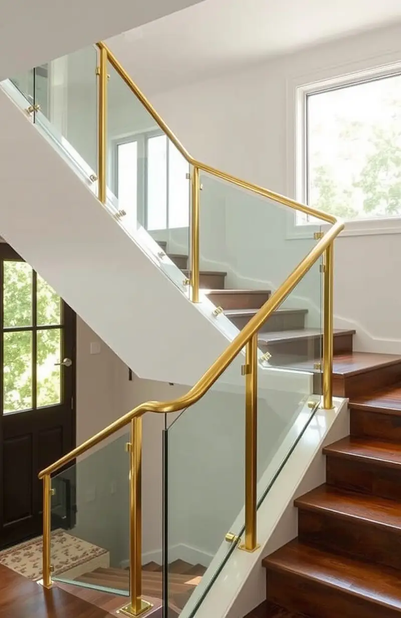 Glass railings with gold accents offer a touch of luxury. They add warmth and opulence to any staircase.
