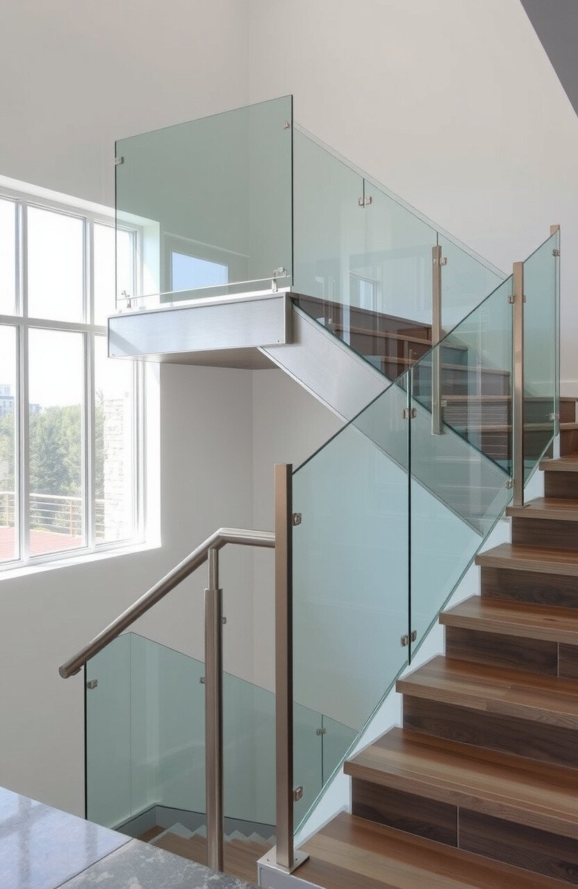 Glass railings with silver accents offer a modern, sleek look. They add a touch of elegance and shine to staircases.