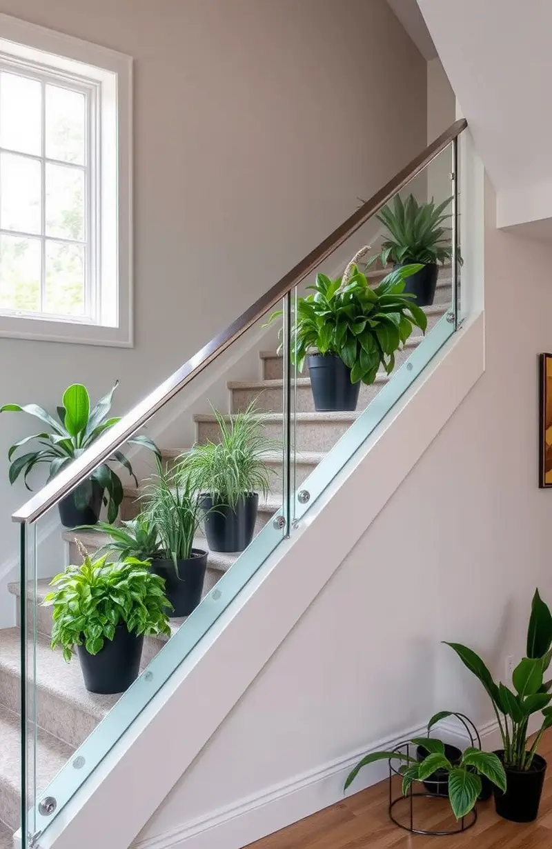 This idea stands out by combining glass with greenery. It’s like having a mini garden on your stairs.