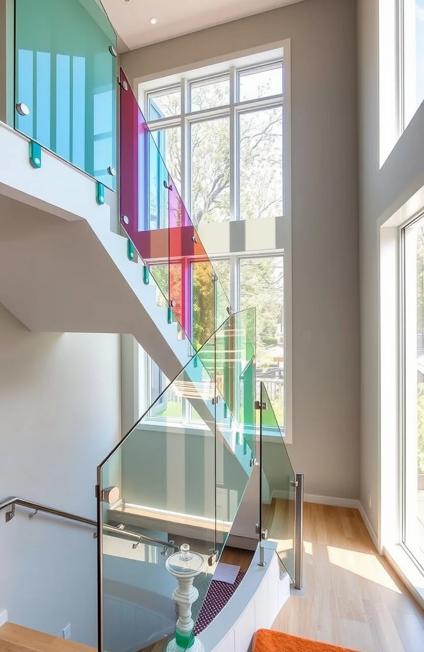 Colored glass railings add vibrancy and personality to staircases. They can make a bold or subtle statement, depending on the hue.