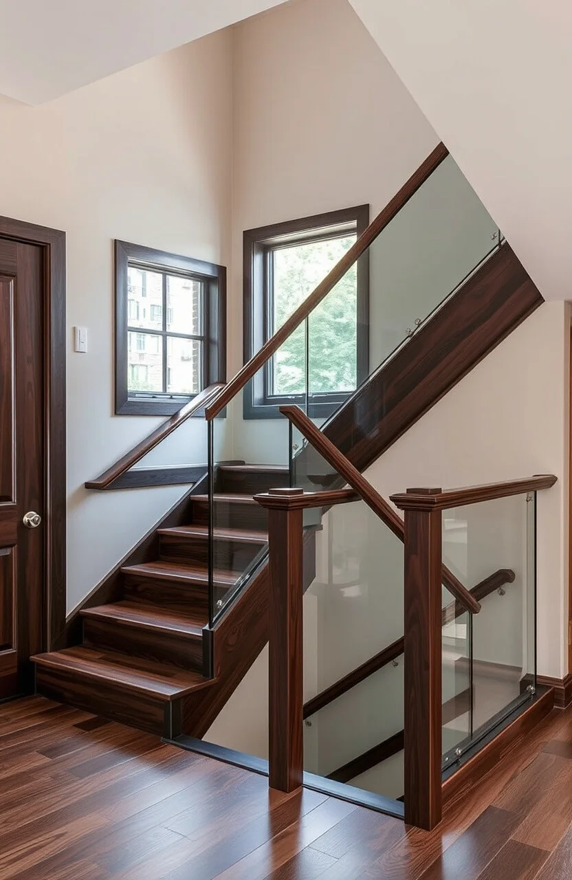 Glass railings with dark wood accents offer a rich, dramatic look. They add depth and warmth to any staircase.