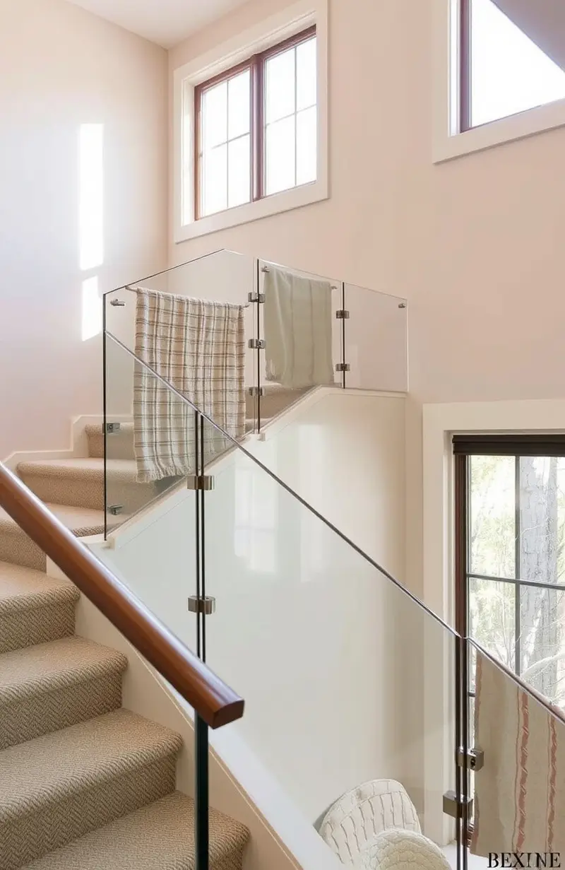 Glass railings with textile inserts add a cozy, warm touch. They bring softness and texture to staircases.