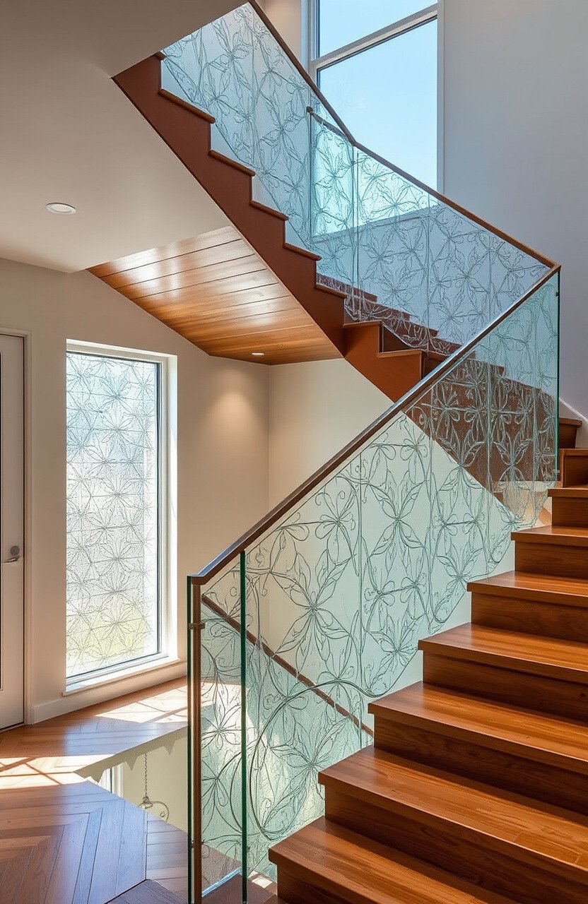 Patterned glass panels can transform a staircase into a work of art. They add texture and interest without cluttering the space.