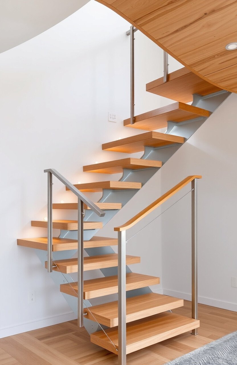 For a clean, contemporary look, consider minimalistic wooden treads with metal supports. This design is sleek and uncluttered.