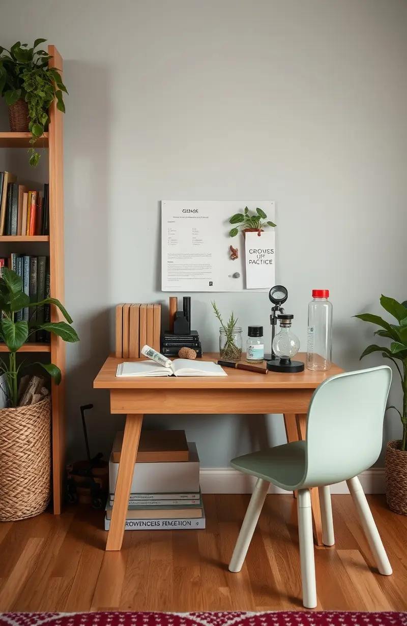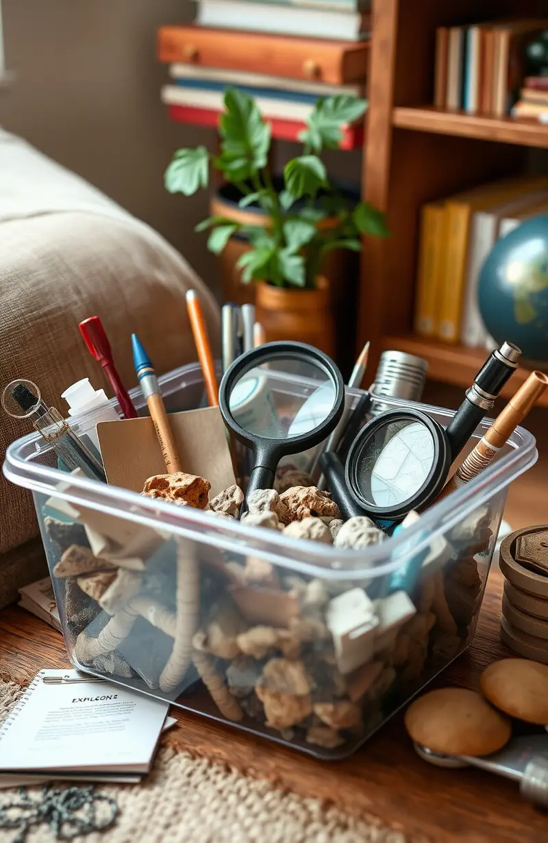 Create a mini science station with a small table and some basic tools. Add a magnifying glass, some rocks, and plant samples.