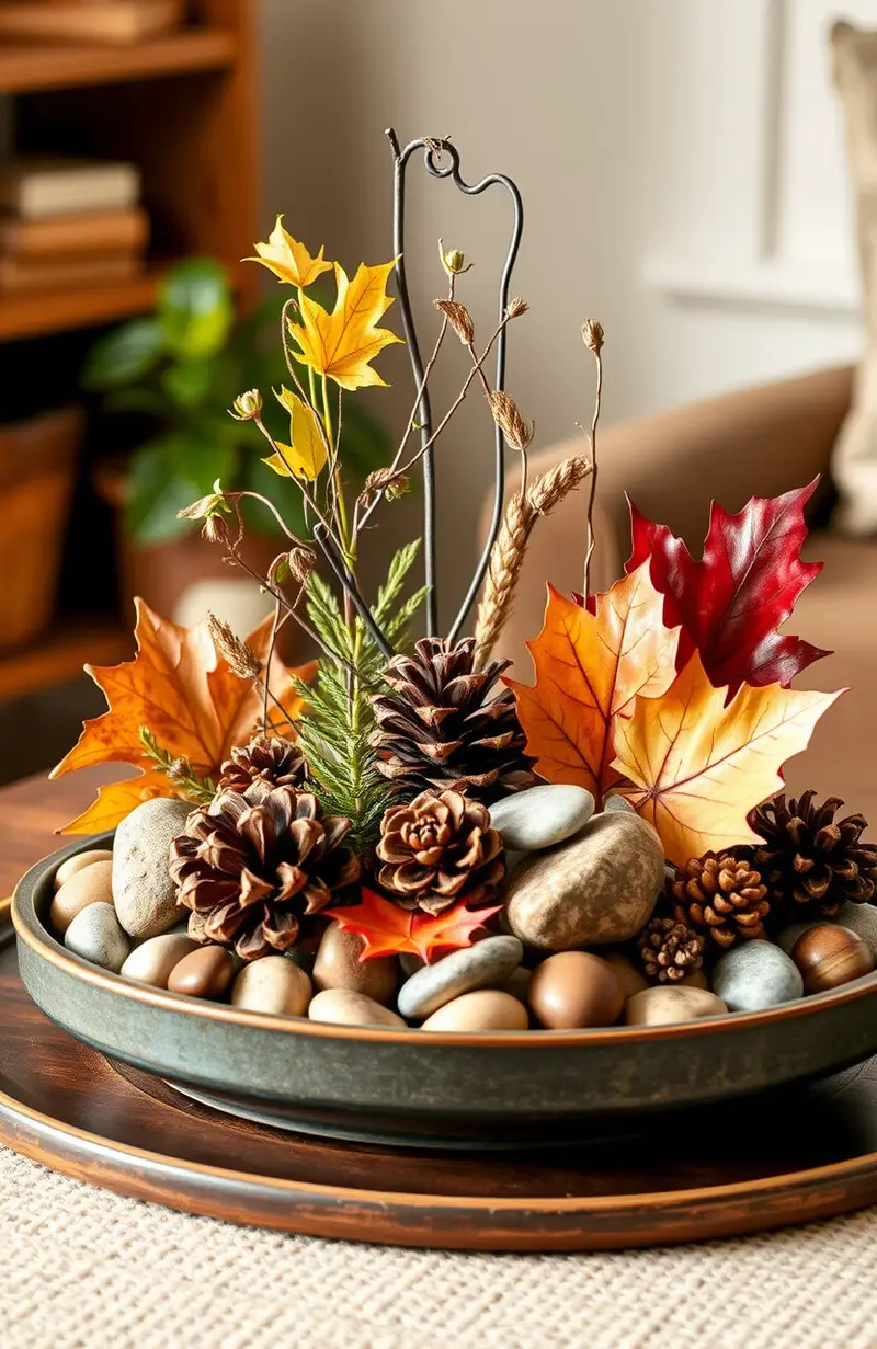 Bring the outdoors inside with a nature display. Collect leaves, pinecones, and stones to create a natural centerpiece.