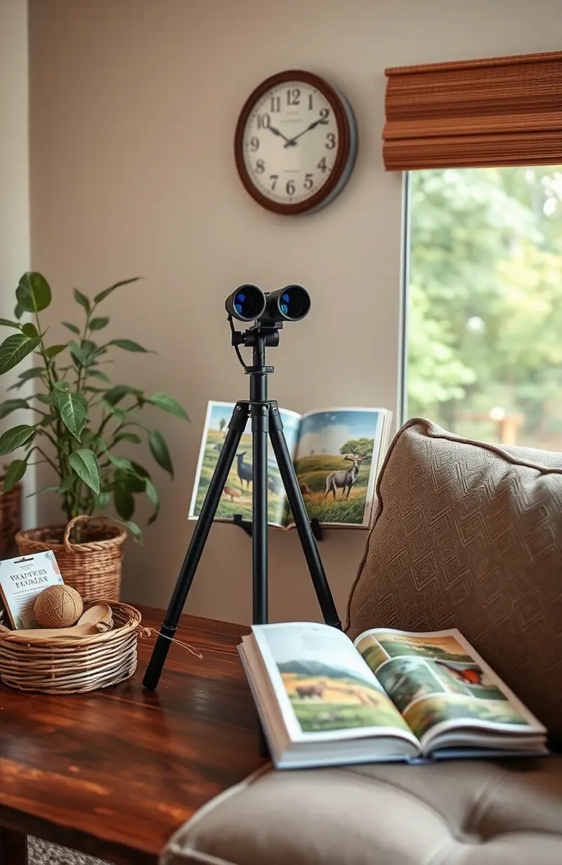 Create a wildlife watching zone with binoculars and a nature book. It’s a space for observing and learning about local wildlife.