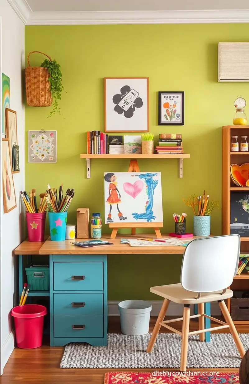 Reuse old jars and containers to organize supplies. Display their artwork on the wall to make it personal and inspiring.