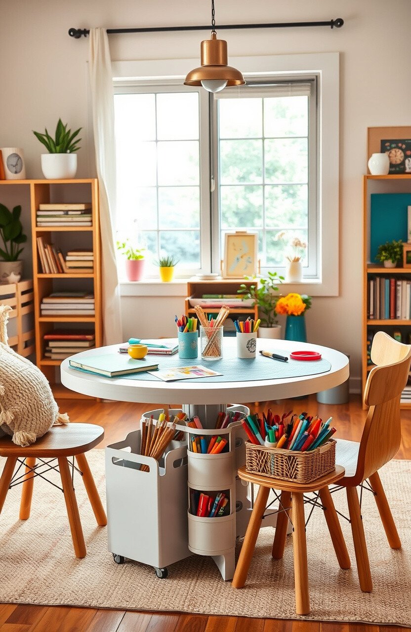 A craft table can be a hub of creativity. Equip it with paper, glue, scissors, and other craft supplies.