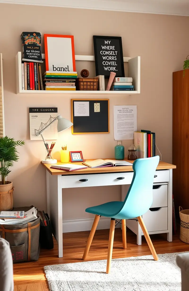 Use an existing desk or find a second-hand one. Personalize it with a desk lamp and a few motivational quotes.