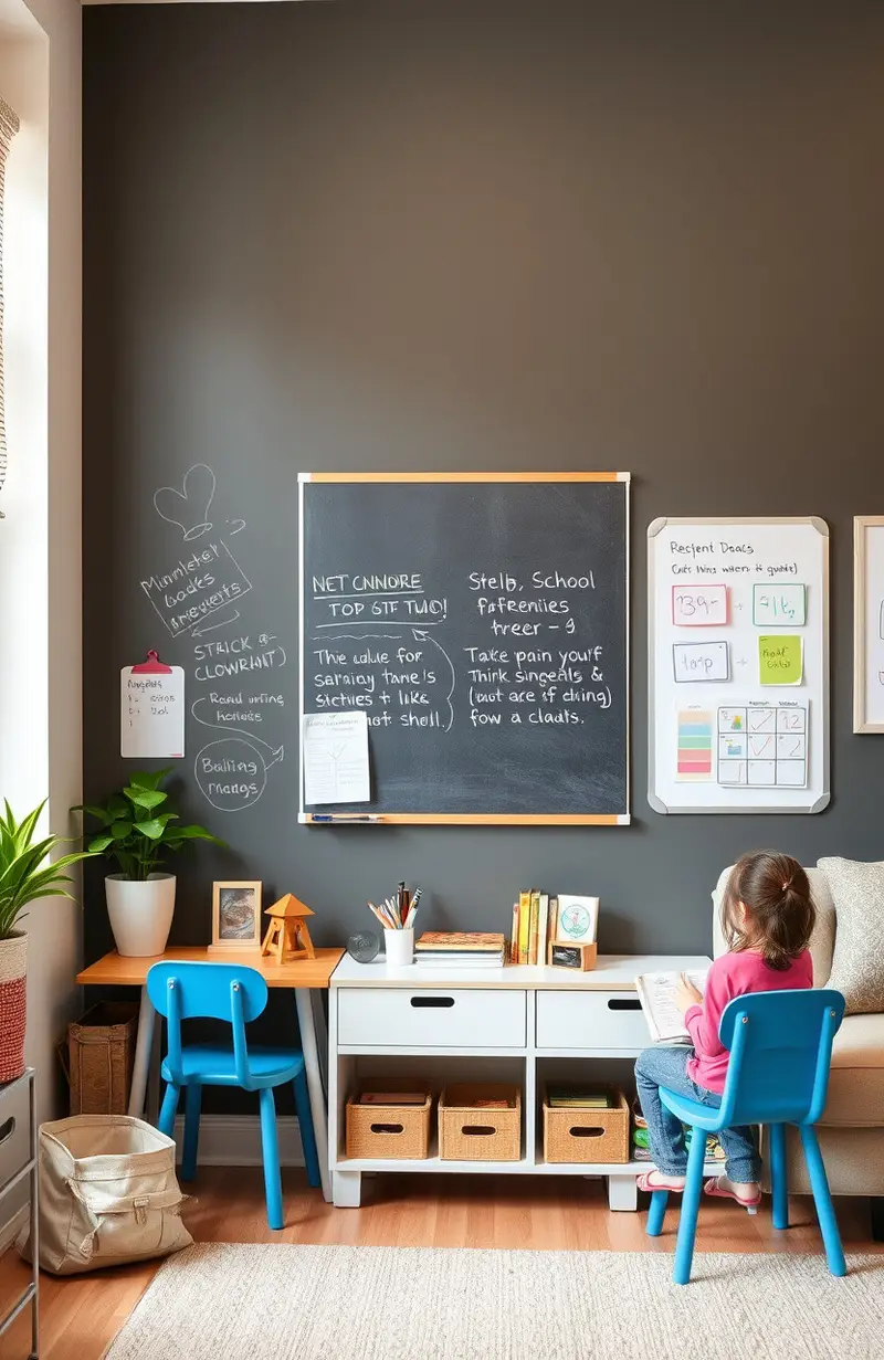 Make one wall interactive with a chalkboard or whiteboard. Kids can write, draw, and solve problems right on the wall.
