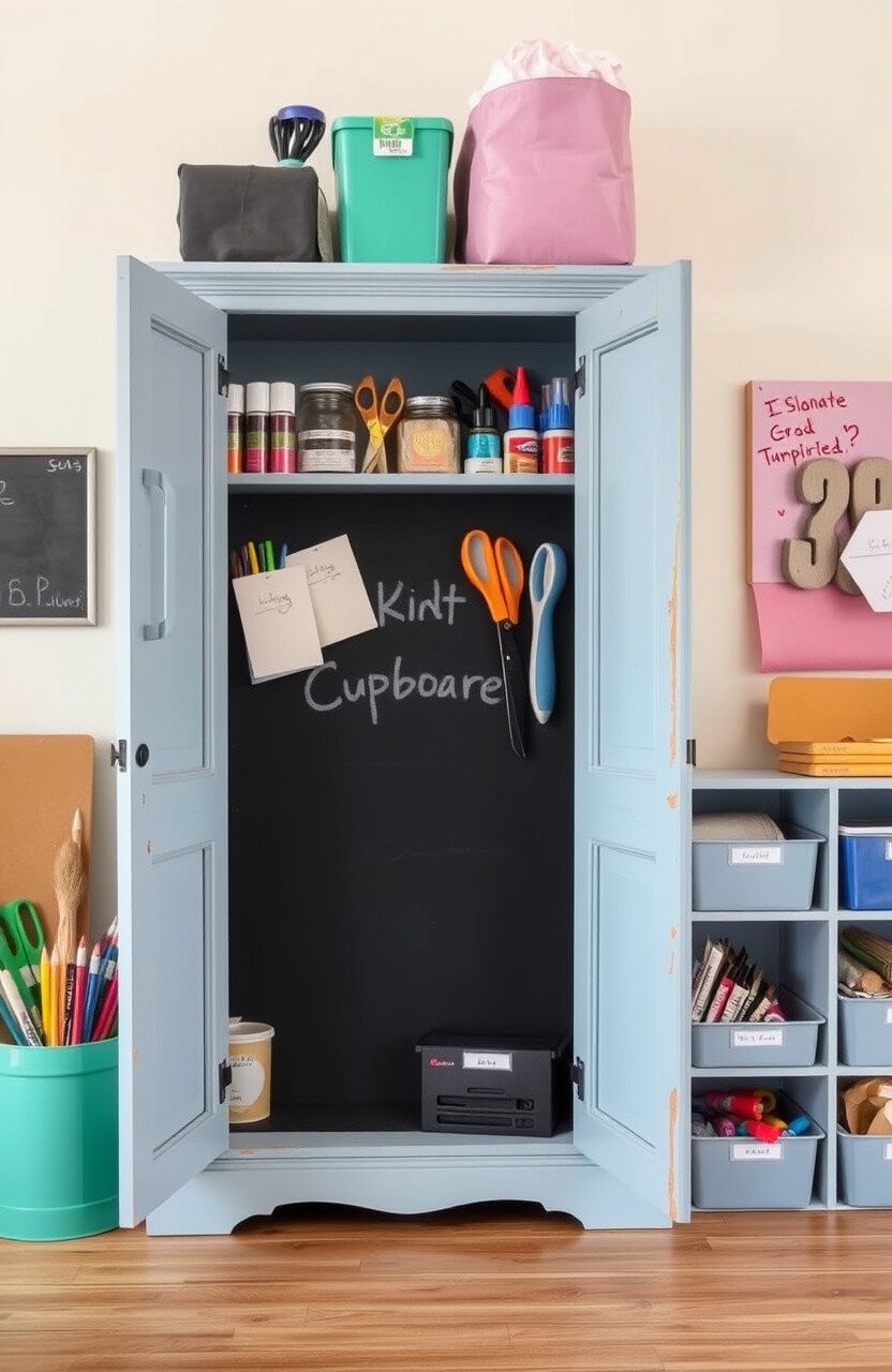 A craft cupboard organizes supplies neatly. Include paper, glue, and scissors for endless creativity.