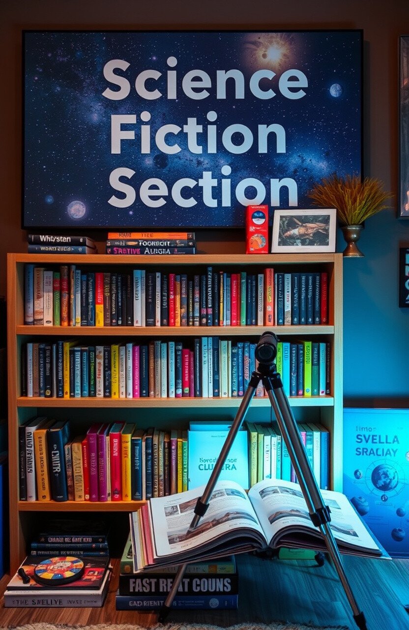 Create a science fiction section with books and posters. Add a small telescope for stargazing inspiration.