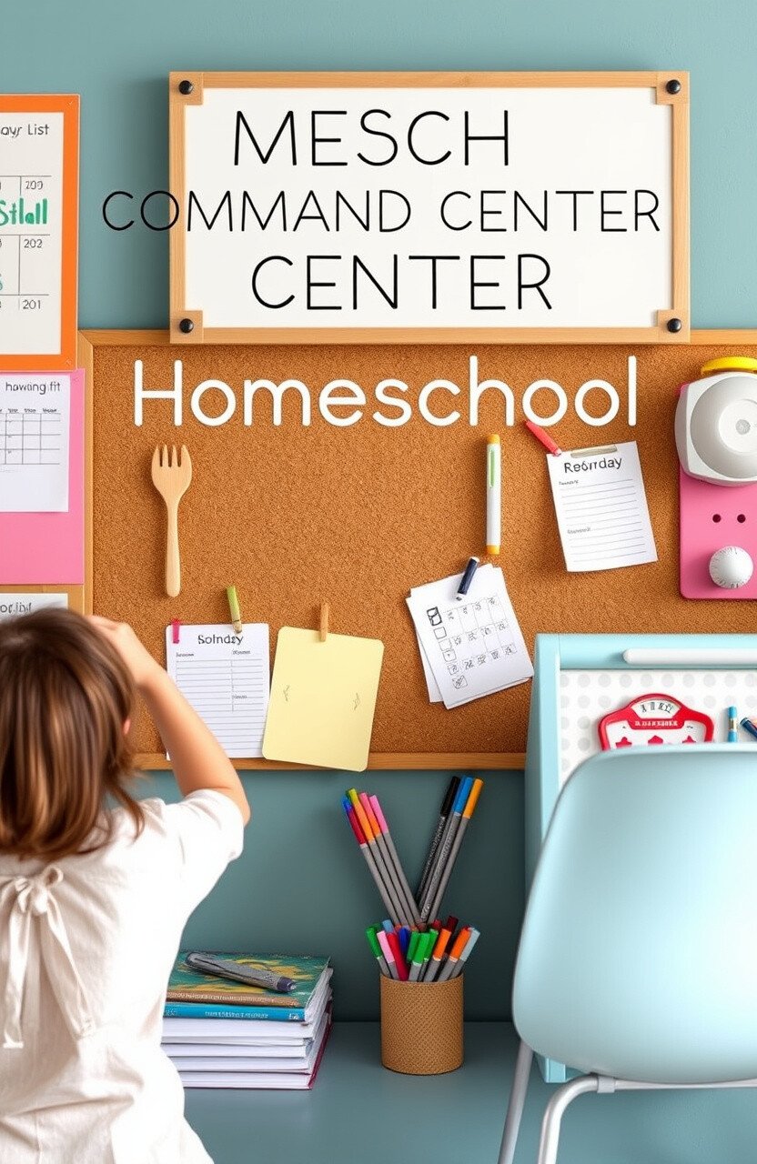 A homeschool command center keeps everyone organized. Use a corkboard or whiteboard for schedules and reminders.