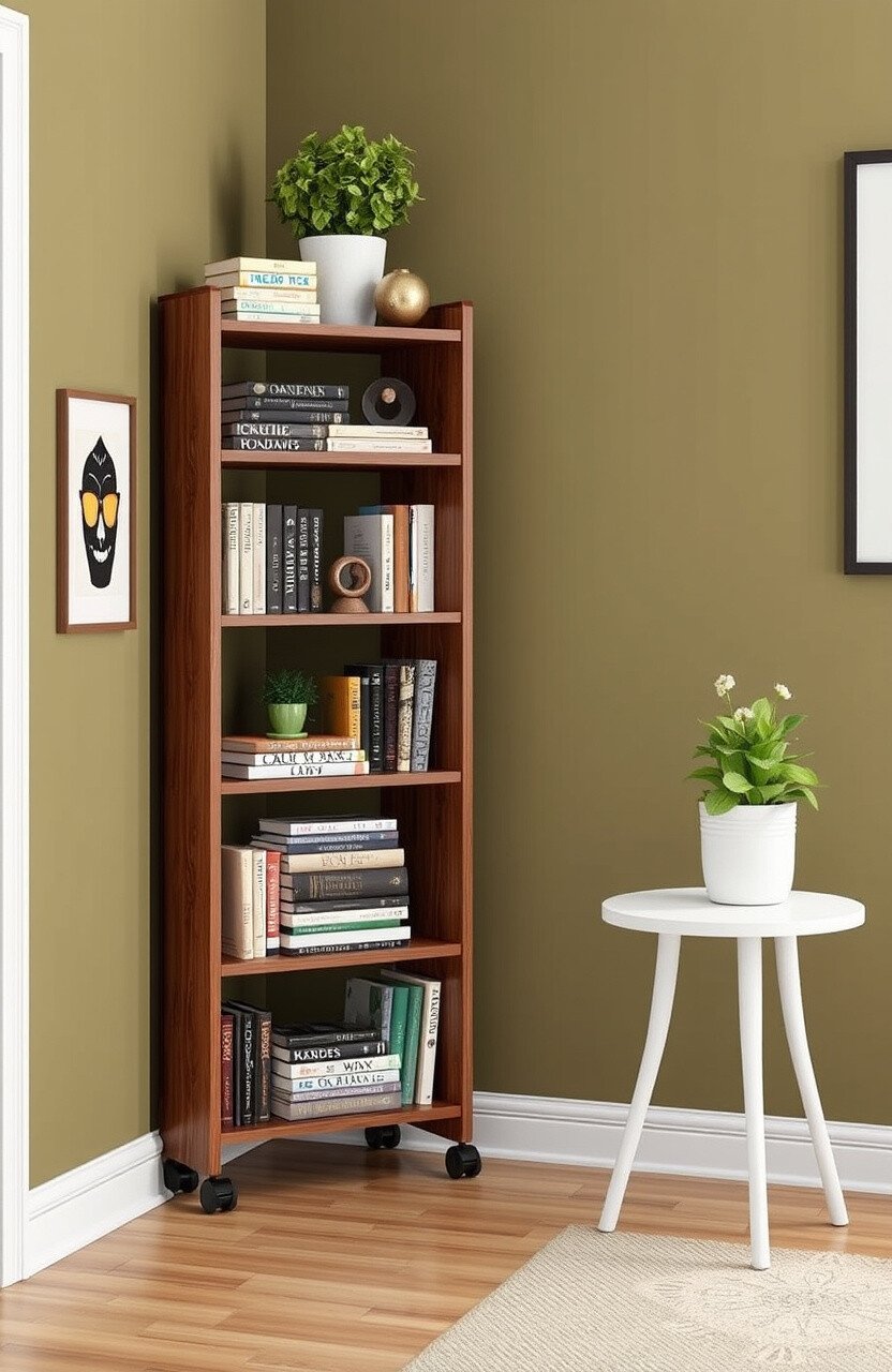 A rotating bookshelf adds a fun twist to storage. Perfect for easy access to a large collection in a compact space.