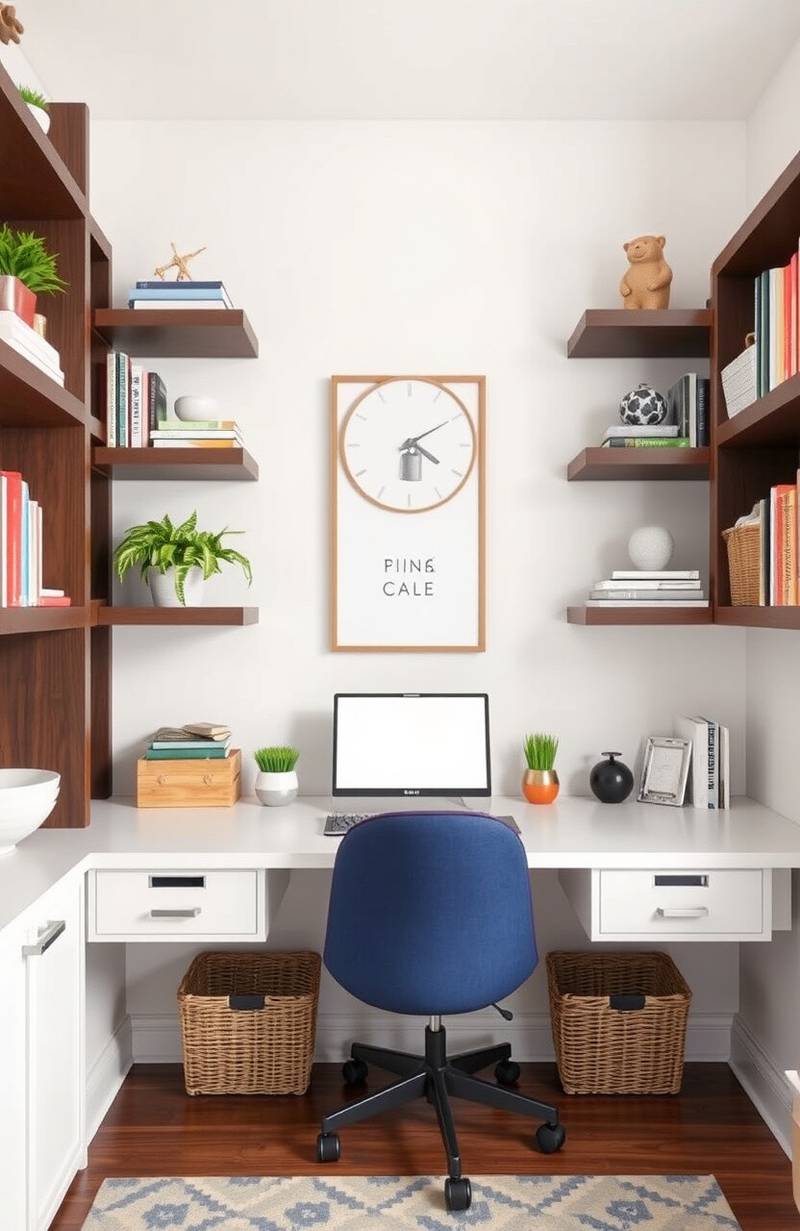 Choose colors that complement your room’s design. Add baskets for hidden storage on the shelves.