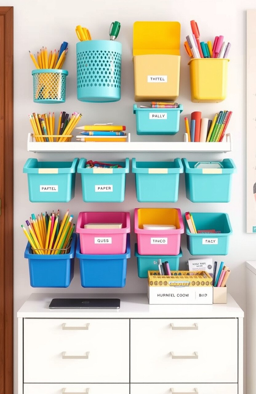 Wall-mounted organizers keep school supplies tidy and accessible. They save floor space and add to the room’s decor.