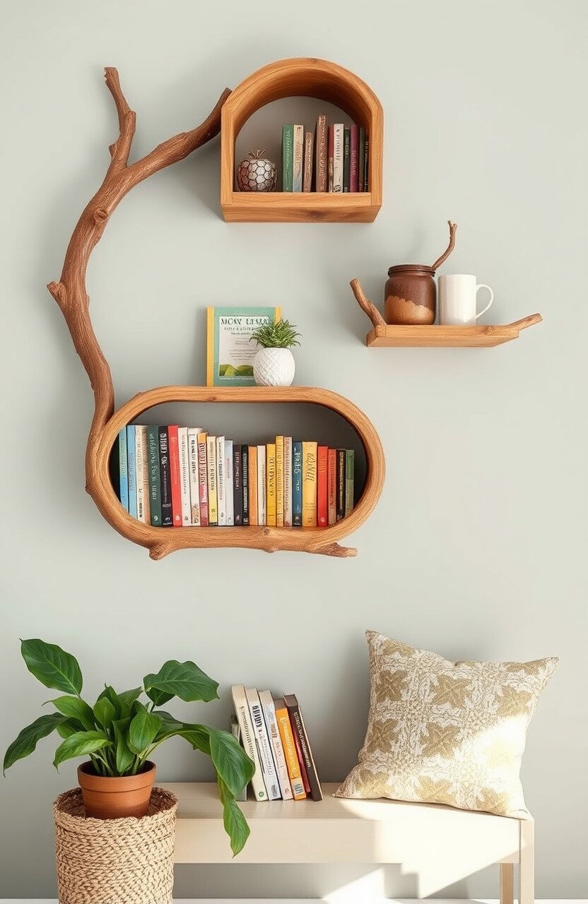 Tree branch shelves bring a touch of nature indoors. They’re perfect for creating an organic, rustic look.