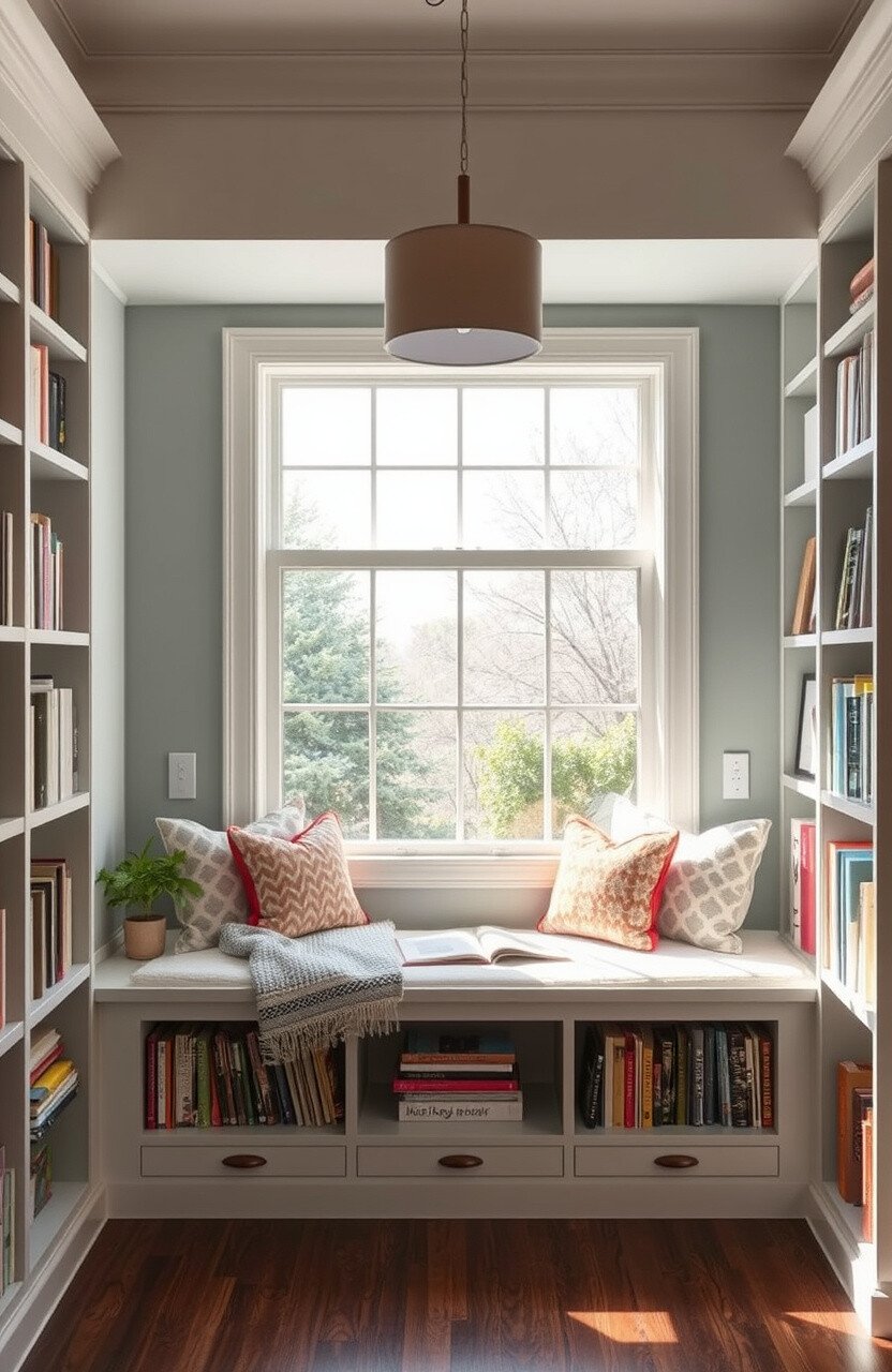 A window seat bookshelf combines comfort and functionality. It’s perfect for curling up with a book in natural light.