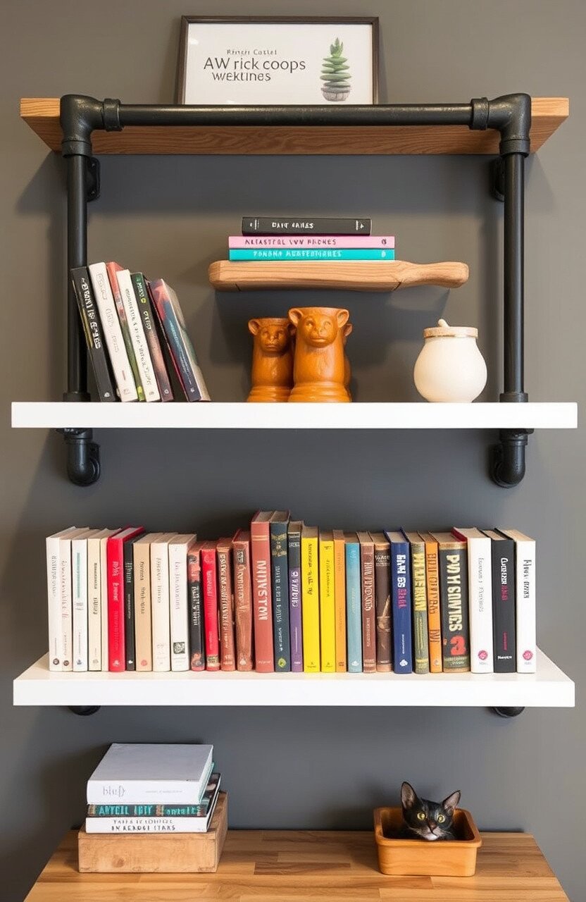 Ladder shelves offer a rustic charm with their simple, open design. They’re perfect for displaying books and decorative items together.