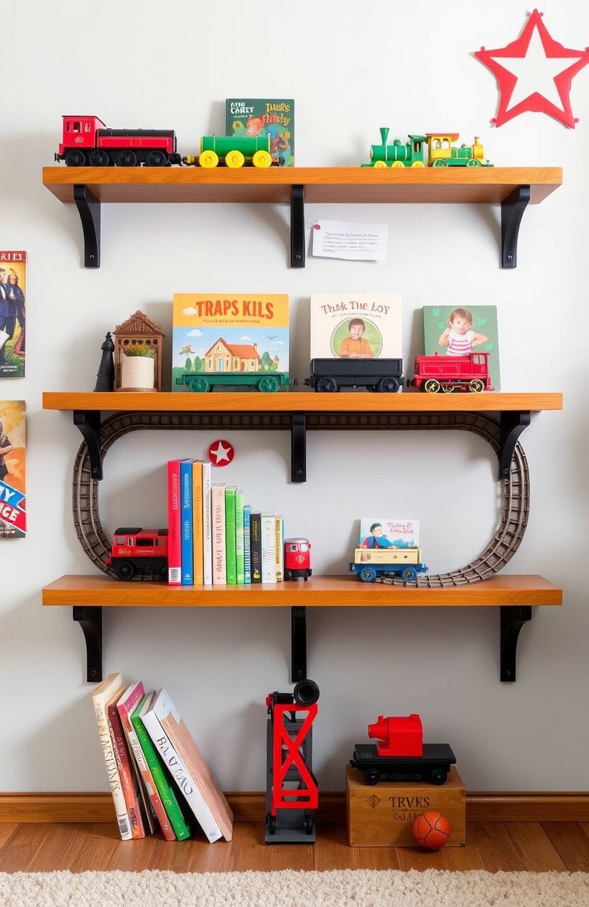 A train track shelf adds excitement and movement to any room. It’s perfect for holding books and train-themed decor.