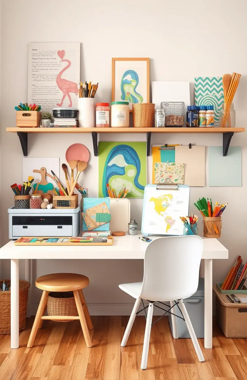 Organize supplies in bins and jars, and add a table with a protective cover. Personalize with a display of finished projects.
