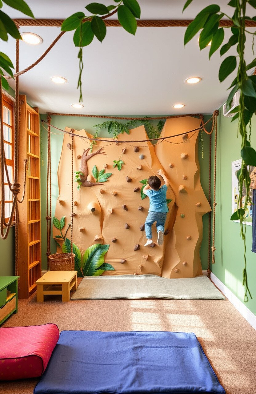 Include soft mats for safety, and personalize with jungle-themed decor. A climbing wall can be a central feature.