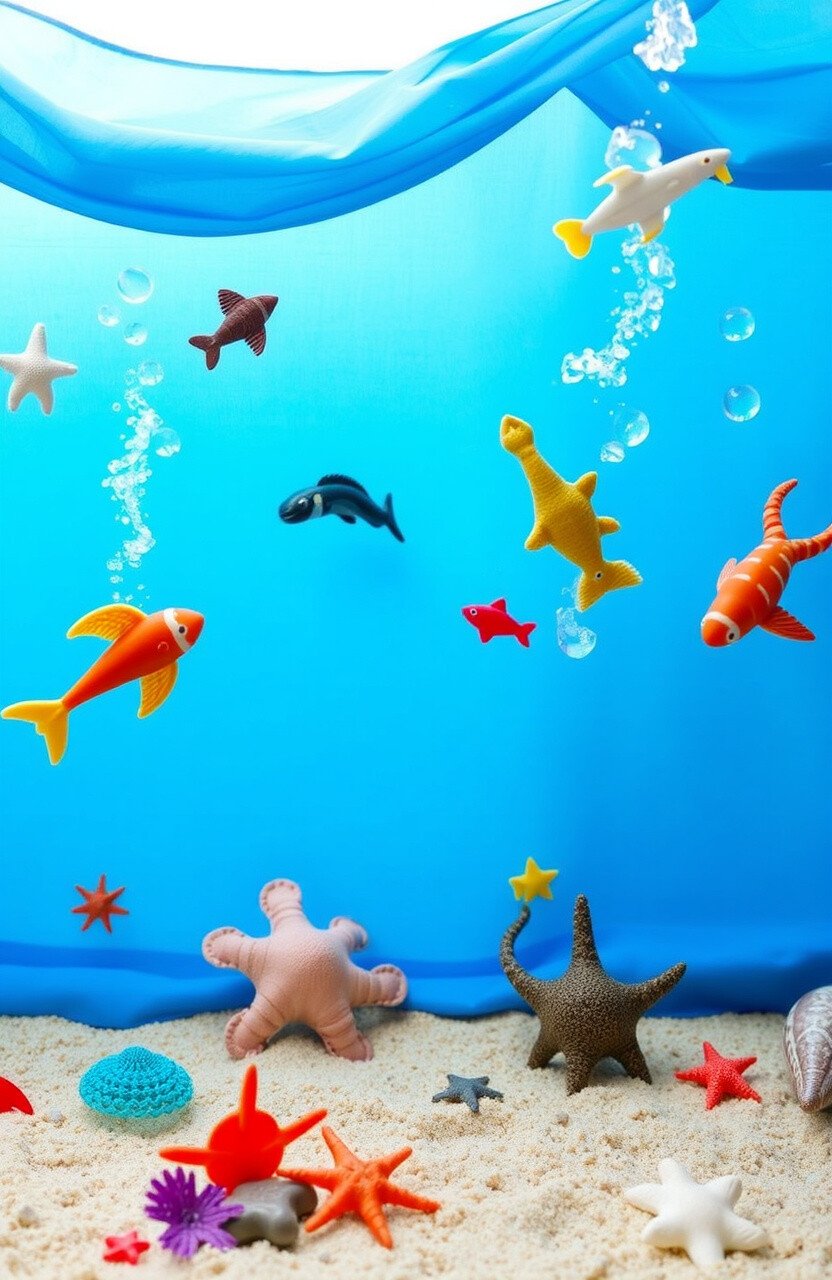Use blue fabric for waves and personalize with sea creature toys. A sandbox can simulate the ocean floor.