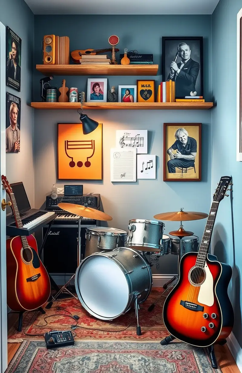 Arrange instruments within easy reach, and consider soundproofing for noise control. Personalize it with posters of favorite musicians.