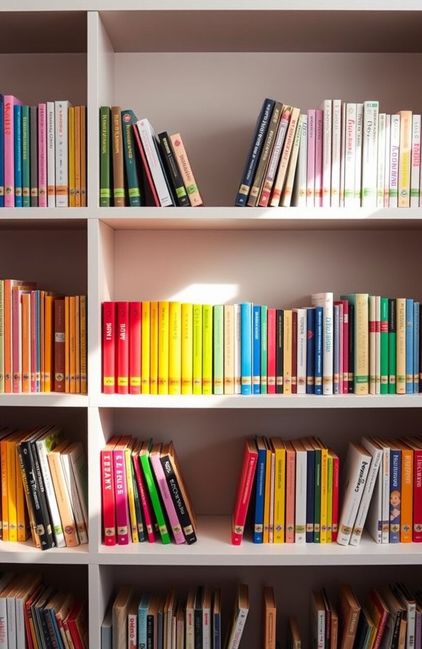 Use colored tape or stickers on book spines for easy categorization. Arrange them from light to dark shades for a stunning display.