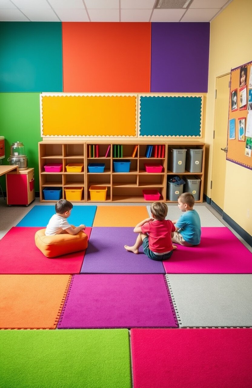 Bright mats create a soft and colorful seating area. They define spaces for different activities.