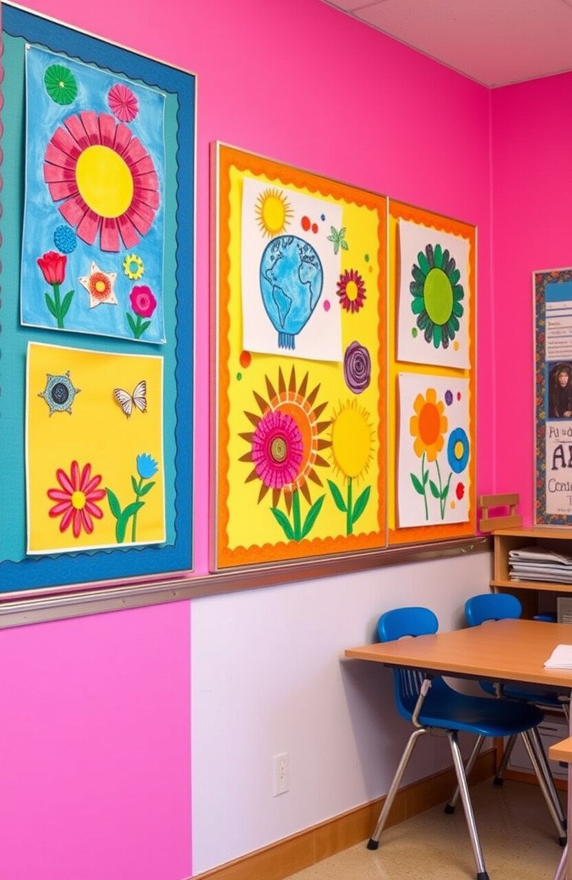 Colorful displays for art projects make students’ work pop. They create a gallery vibe in the classroom.