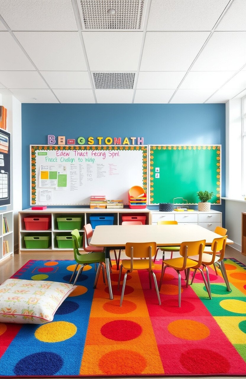A vibrant rug adds warmth and comfort to the classroom. It creates a welcoming space for group activities.