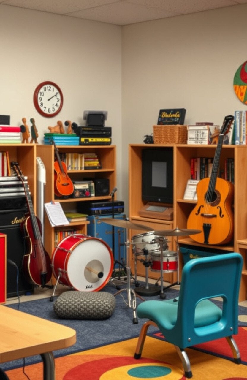 Picture a corner alive with sound and rhythm. A music area encourages exploration of instruments and musical expression.