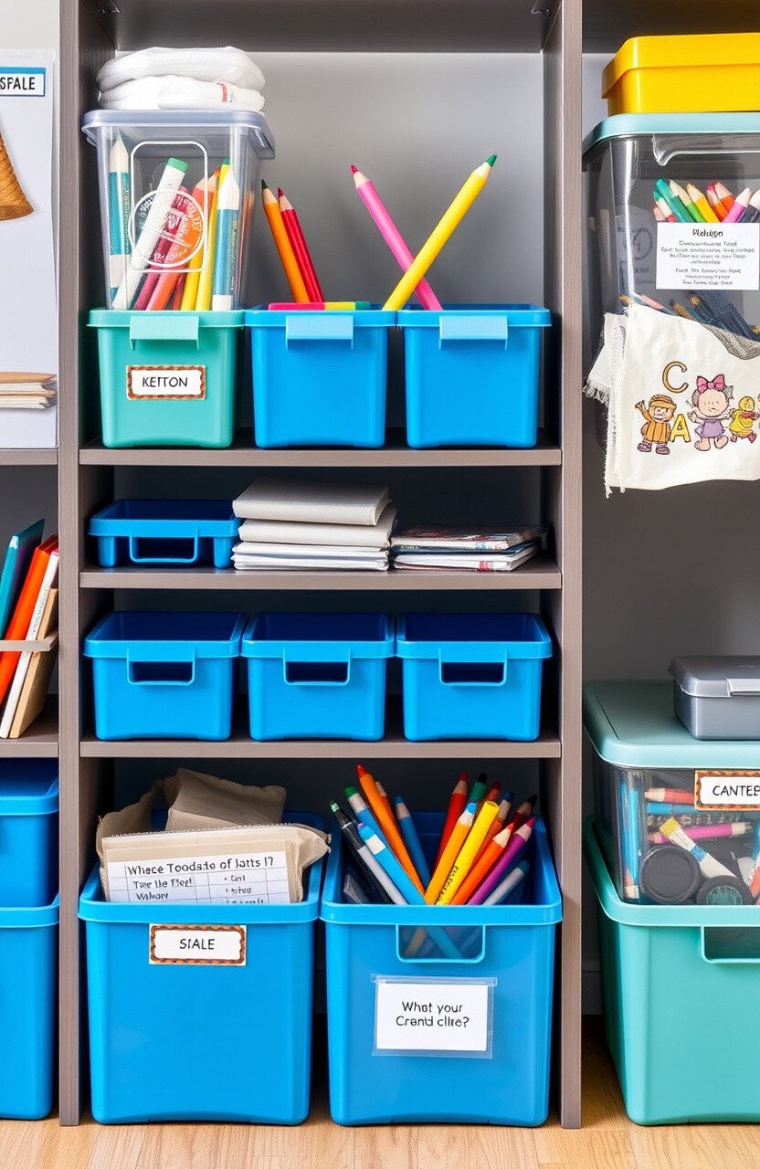Color-coded bins and shelves can make tidying up fun. Clear containers let students see where everything goes.