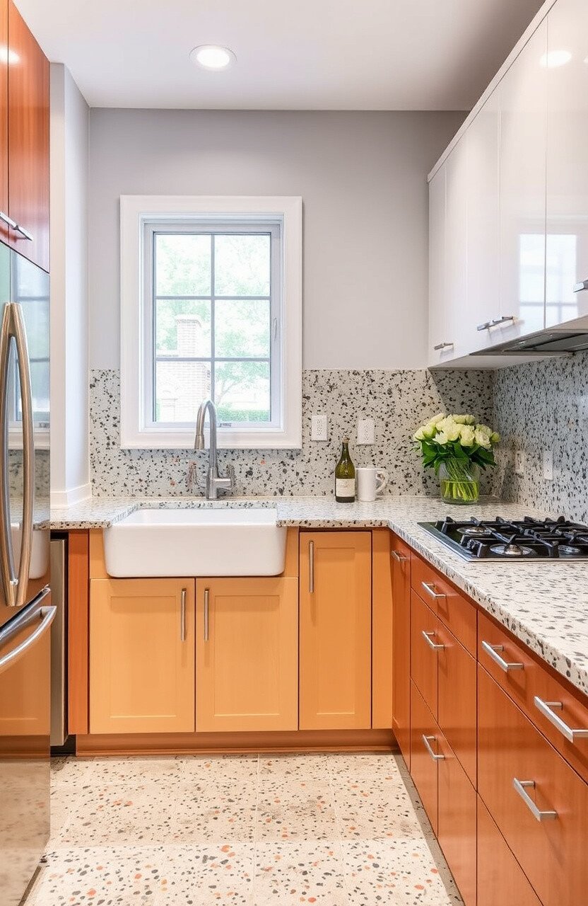 Terrazzo countertops offer a retro look with modern flair. They are known for their colorful, speckled appearance.