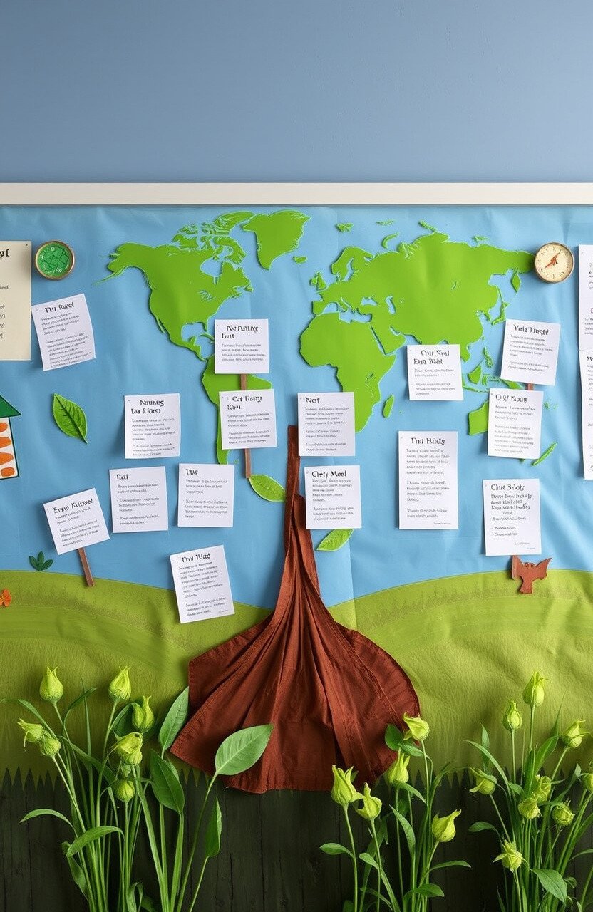 Take students on a geographical adventure with a board featuring maps and landmarks. Use colorful pins and strings.