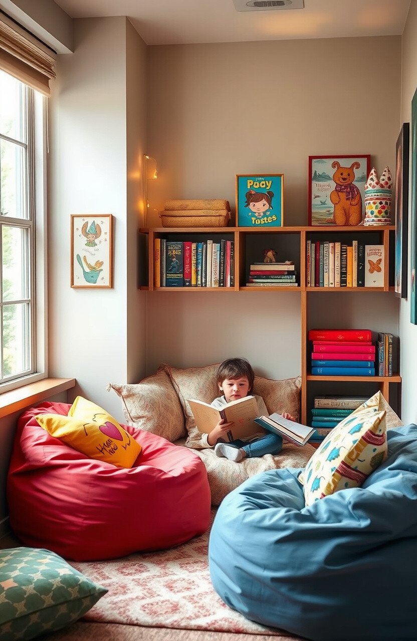 A cozy reading nook invites kids to dive into books. Use bean bags and soft cushions for comfort.