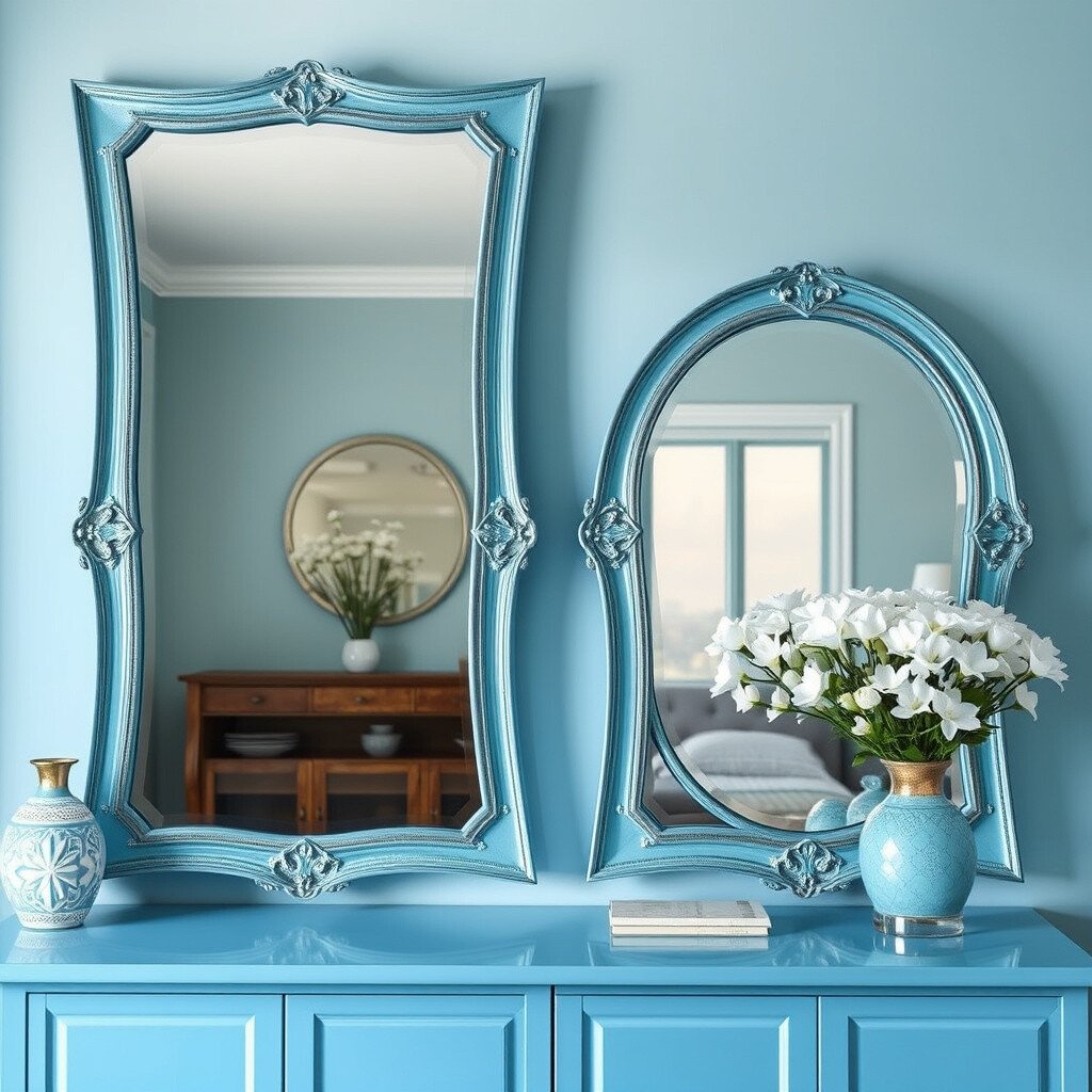 The blue tint adds a unique twist to traditional mirrors. They’re perfect for entryways or small rooms.