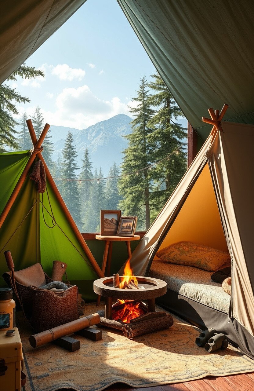 Design a camping corner with tents and maps for exploration. Include binoculars for bird watching.