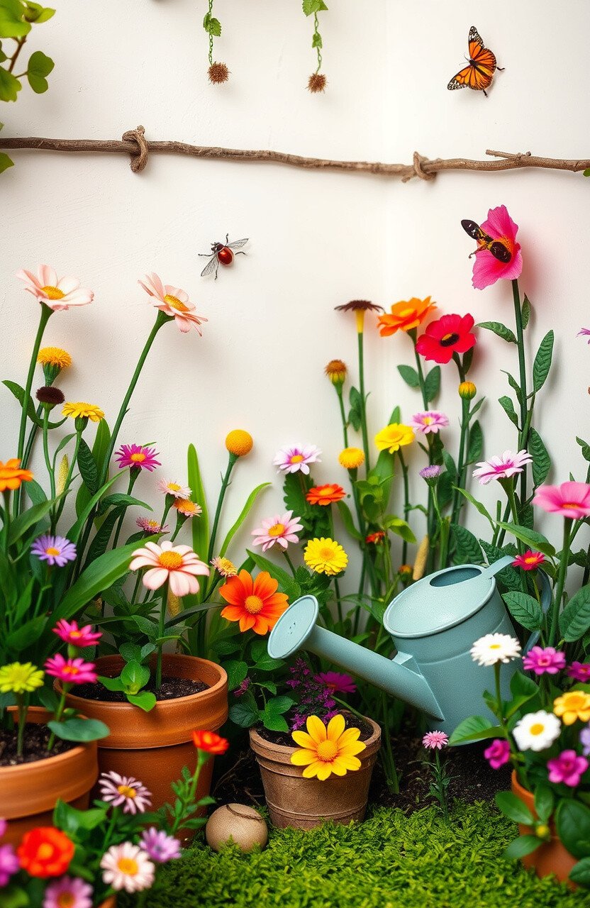 Transform a corner into a blooming garden with artificial flowers and insect decorations. Include a small watering can for pretend play.