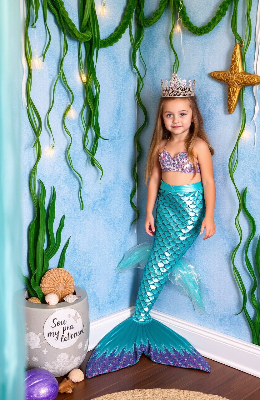 Personalize with seashells and a homemade mermaid crown. A trending idea is to use iridescent fabrics for a magical touch.