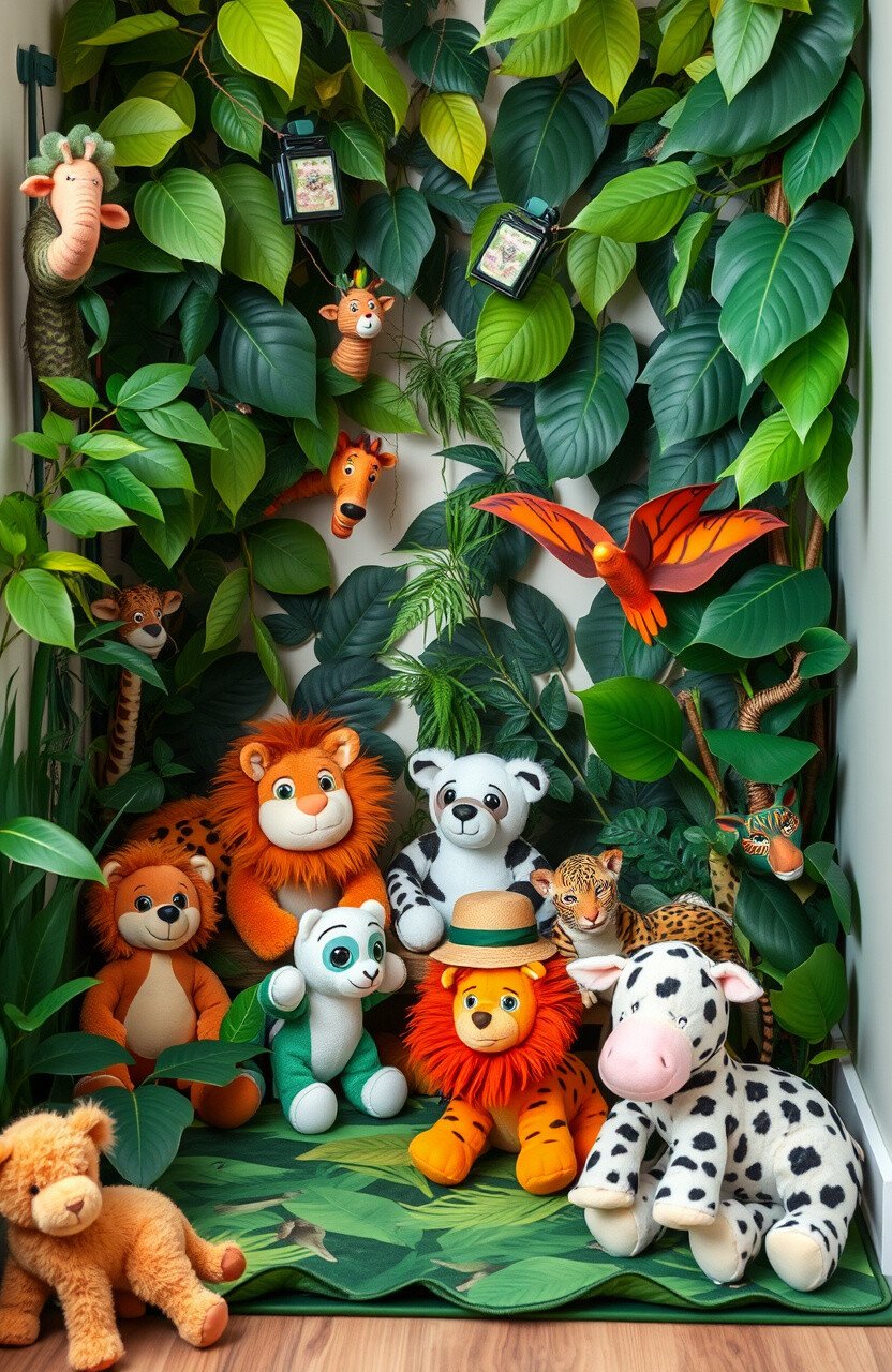 Transform a corner into a jungle with stuffed animals and leafy decorations. Include a play mat for interactive fun.